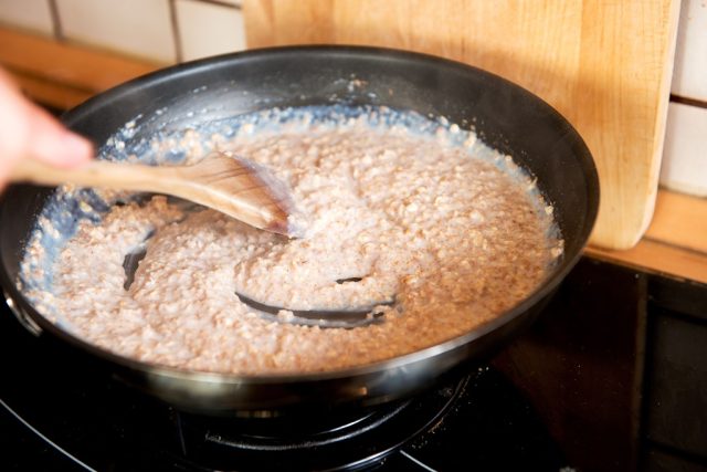 Nastrouháme si 600 g oloupaných brambor nahrubo a vymačkáme z nich vodu. Přidáme do nich prošlehané vajíčko, sůl a pepř. Těstem vyložíme předem vymazanou kulatou formu na koláč a vytvoříme zvýšené okraje. Vložíme do trouby, kterou jsme předehřáli na 200 °C. a pečeme necelou půlhodinku, aby brambory změkly a začínaly zlátnout. Mezitím si nakrájíme čtvrt kila slaniny vcelku na malé kostičky nebo nudličky a ty opečeme dozlatova na pánvi.