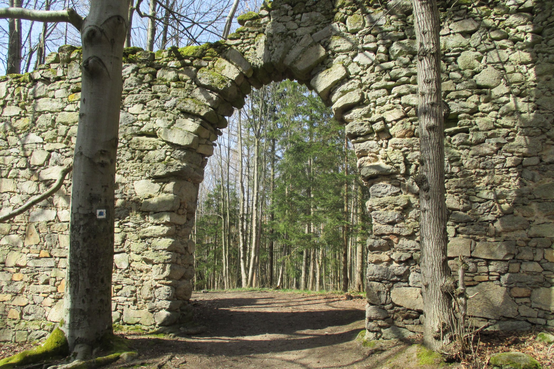 Kamenné věže a hradby za téměř 200 let, co tu umělá zřícenina stojí, pokryly mechy a lišejníky. Vlastním odhadem tak stáří hradu alias zříceniny nepoznáte. Nebýt tu nenápadná cedulka Klubu českých turistů, že se jedná o repliku hradu.
