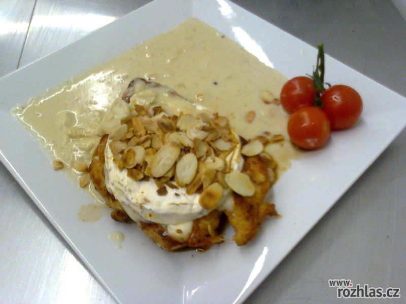 Mandlové lupínky opražíme dorůžova. Kuřecí prsíčka otřeme vlhkou utěrkou, naklepeme a osolíme. Na pánvi rozpálíme olej a připravená prsíčka po obou stranách opečeme asi 3 minuty z každé strany. Pak je odložíme na teplé místo. Do šťávy po opékání masa vmícháme kečup a povaříme.