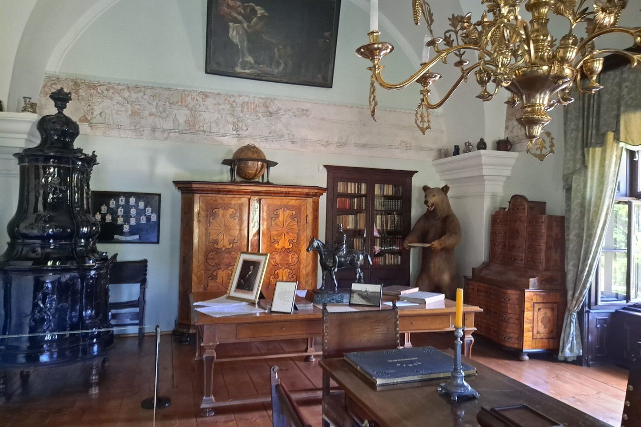 „Tady to působí jako takový prvorepublikový prostor, skoro jako nějaké kulisy z filmu pro pamětníky,“ říká kastelán Tomáš Horyna, který nás po schodišti dovedl do rozlehlé haly v podkroví. Do bývalého půdního bytu zámeckých pánů mohou návštěvníci nahlédnout posledních patnáct let. Zatím nebylo možné navštívit největší podkrovní místnost, teď ale finišují její stavební úpravy a správa zámku plánuje, že se brzy stane další zastávkou na prohlídkovém okruhu.