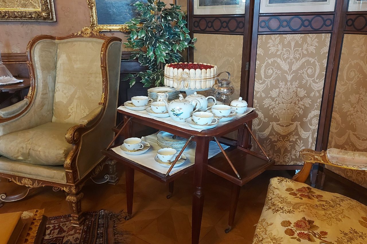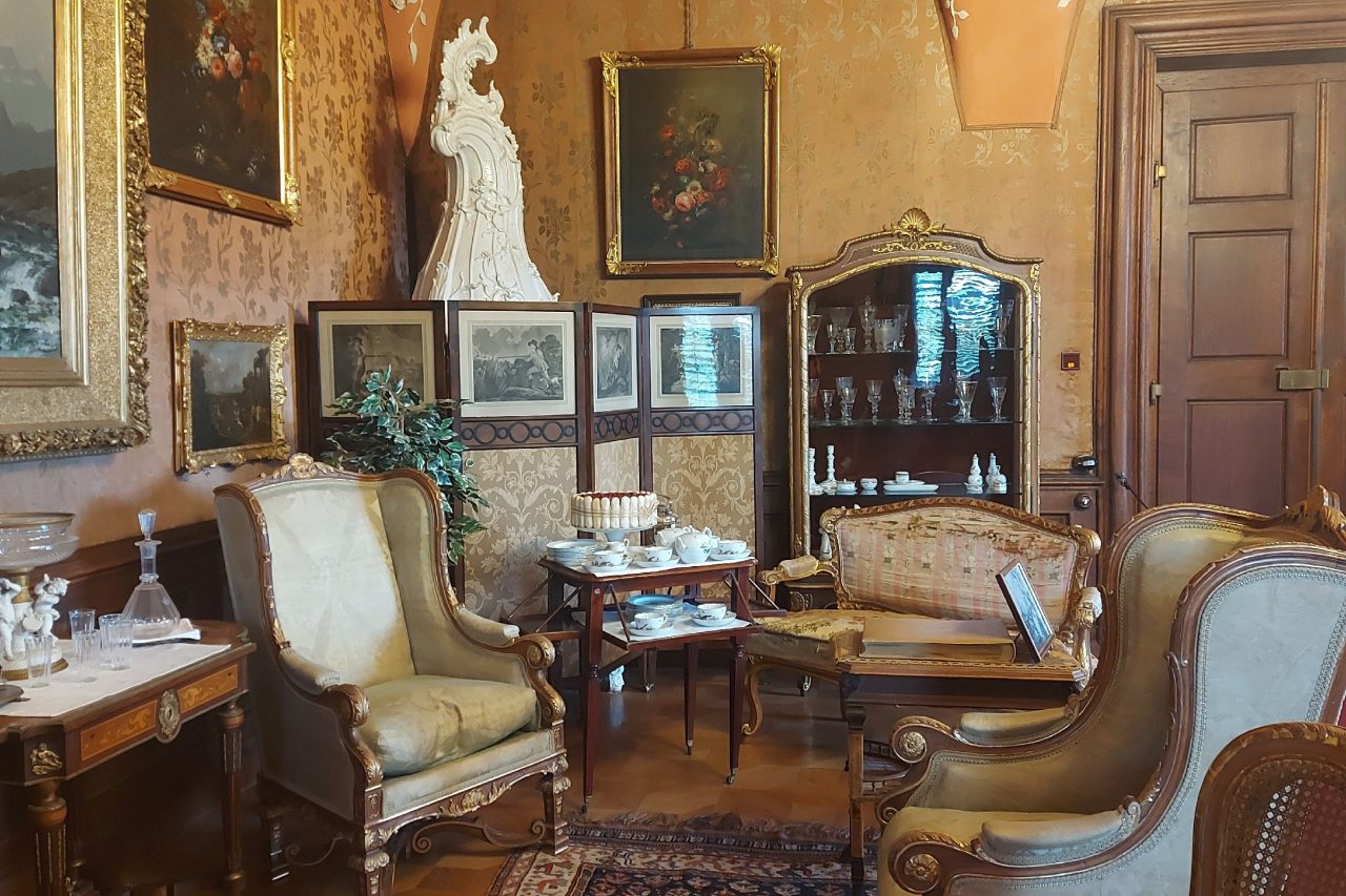 V Růžovém salonku se scházela dámská společnost. Dámy zde mezi čtvrtou a pátou hodinou s oblibou popíjely anglický čaj ochucený mlékem a pochutnávaly si na dortíku zvaném „Charlotta“ vyrobeném z cukrářských piškotů. V salonu je vše naservírováno a připraveno tak, jako by měla dámská společnost každou chvíli přijít. Ještě větší překvapení pak návštěvníky čeká přímo v reprezentativní barokní jídelně.