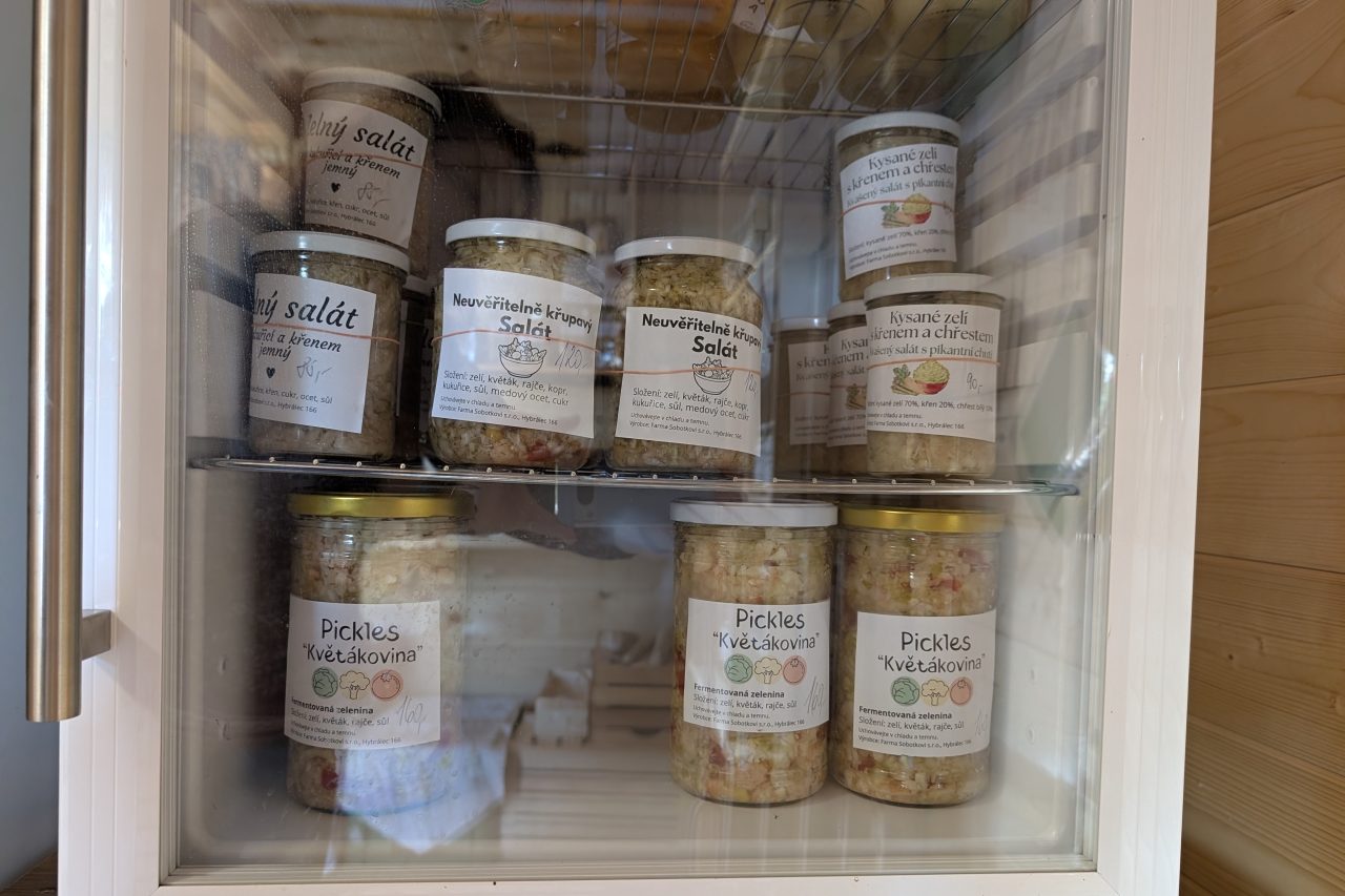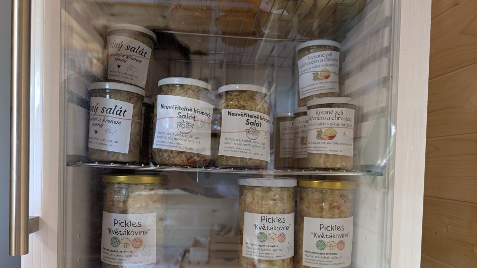 Venku před krámkem jsou na prodej květináče s bylinkami i sazenice rajčat, uvnitř pak všechno ostatní. Letošní úroda je zatím z jihu Moravy od farmářů, kteří je pěstují ekologicky. „Tady z Vysočiny tu bude všechno také, ale zatím je to na poli a roste, protože tady všechno trvá trochu déle,“ vysvětluje Aneta Sobotková a upozorňuje na výrobky, které v krámku vydrží celý rok, dokud se neprodají: „Jsou tady zavařeniny, marmelády, výrobky z cukety, zelný salát a kvašená zelenina, kysané zelí z podzimu.“