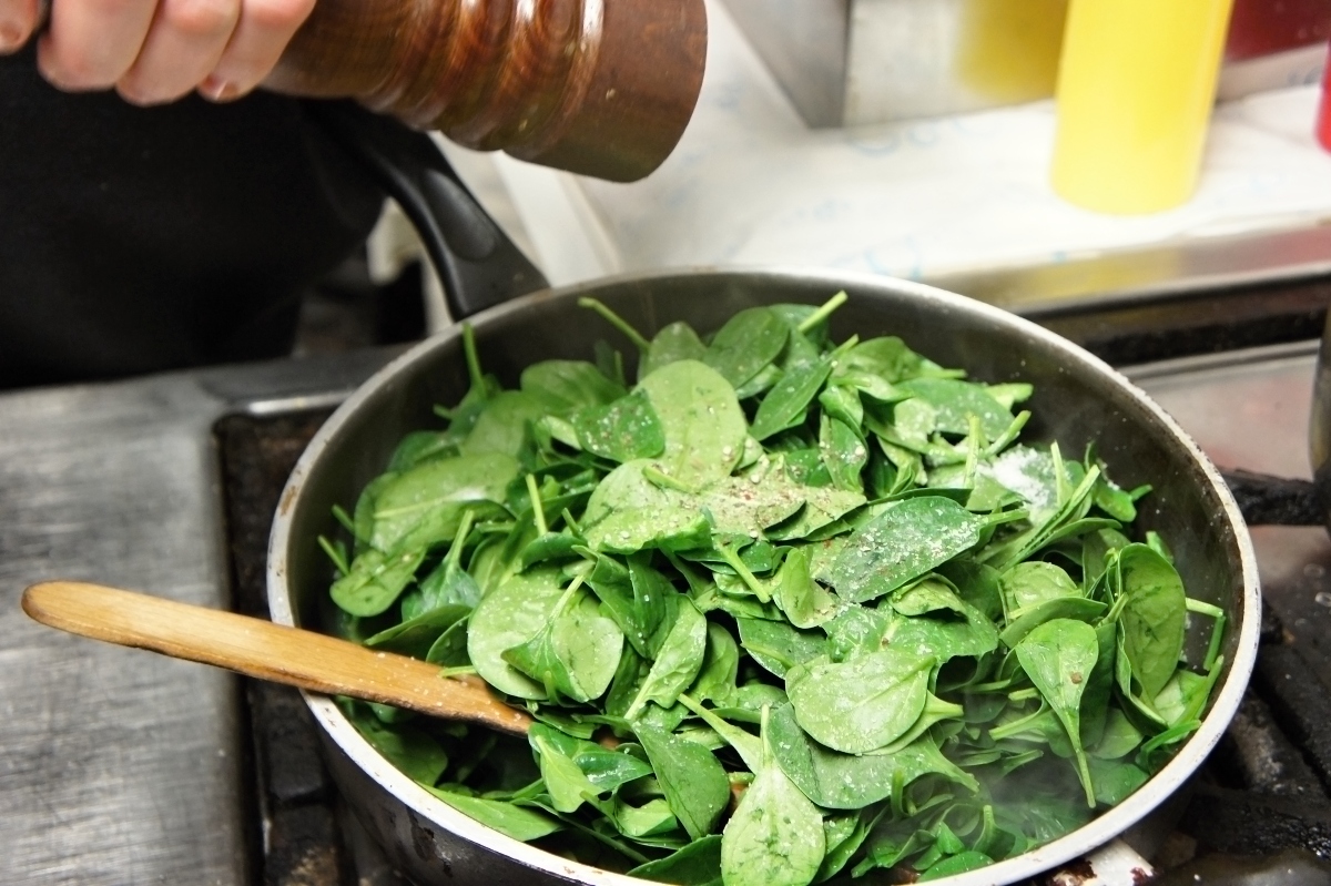 - Přidáme špenát, vývar, nastrouhanou bramboru, osolíme, opepříme a vaříme asi 10 minut.