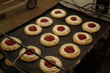 V míse utřeme máslo s cukrem do pěny a postupně přidáváme žloutky jeden po druhém. K utřené hmotě přidáme mouku, sůl, strouhanou citrónovou kůru a připravený vykynutý kvásek. Vše zaděláme zbylým vlažným mlékem, dobře propracujeme a na teplém místě necháme vykynout. Zkynuté těsto rozdělíme na pomoučeném vále na 40 stejných kousků. Z nich uděláme malé koláčky. Okraje potřeme rozšlehaným vejcem a středy naplníme zavařeninou. Koláčky poklademe na pomaštěný plech a po krátkém zkynutí pečeme v předehřáté troubě. Když koláčky začínají růžovět, navršíme na ně tuhý sníh z bílků, posypeme